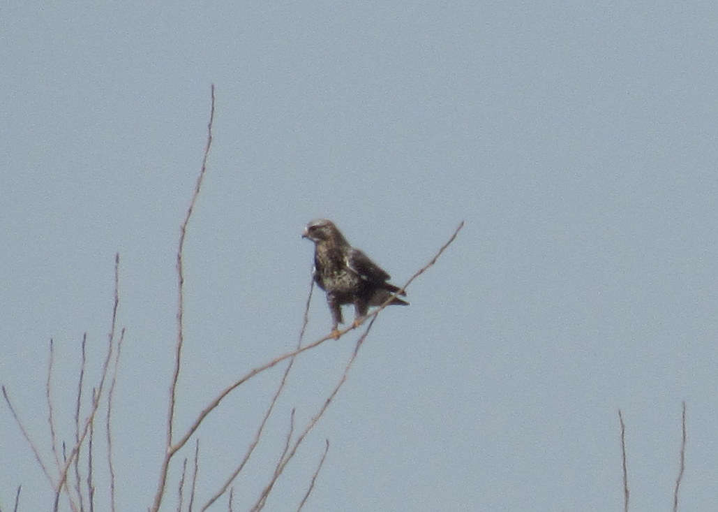 This is the fairly-common-but-I-only-see-it-when-driving-so-thus-it's-difficult-to-photograph Rough-legged Hawk (Buteo lagopus). It's named for its feather-covered legs, clearly visible above. I watched it through my scope until it flew away, back into the "Badlands". Satisfied that I'd finally photographed something, I then left for Forest Glen Preserve.